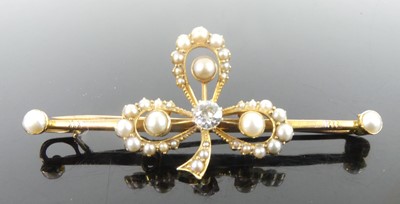 Lot 2646 - A yellow metal diamond and pearl bar brooch in...