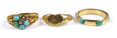 Lot 2608 - An 18ct gold and turquoise set band ring (one...