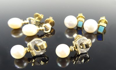 Lot 2683 - A pair of 18ct gold cultured pearl and blue...