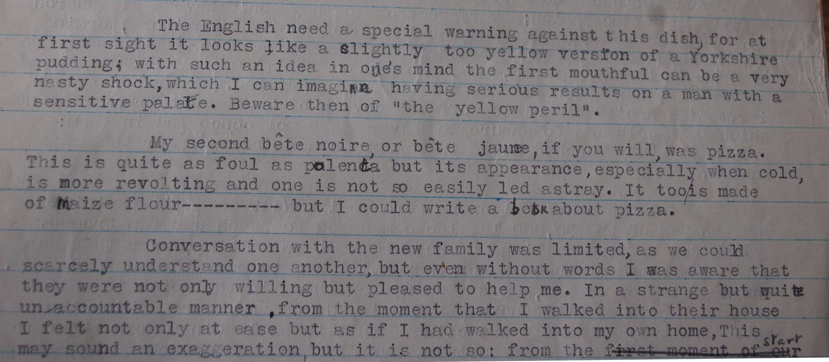 His story is funny, fascinating and devastating at points. Accompanying the manuscript, this lot includes the forged identity paper Smith mentions having made up with the name Morelli Ugo (whilst severely hungover), a telegram from his wife who was based at Bletchley begging him to 'RETURN QUICKLY - I LOVE YOU', and post-war letters from the Italian families who supported him describing their awful situation after the war and asking for support themselves. Smith clearly intended to publish; there is a letter with notes from an interested publisher, but it appears that the manuscript 'Capistrello' (named after the village where Hewison-Smith stayed the longest) never made it print.