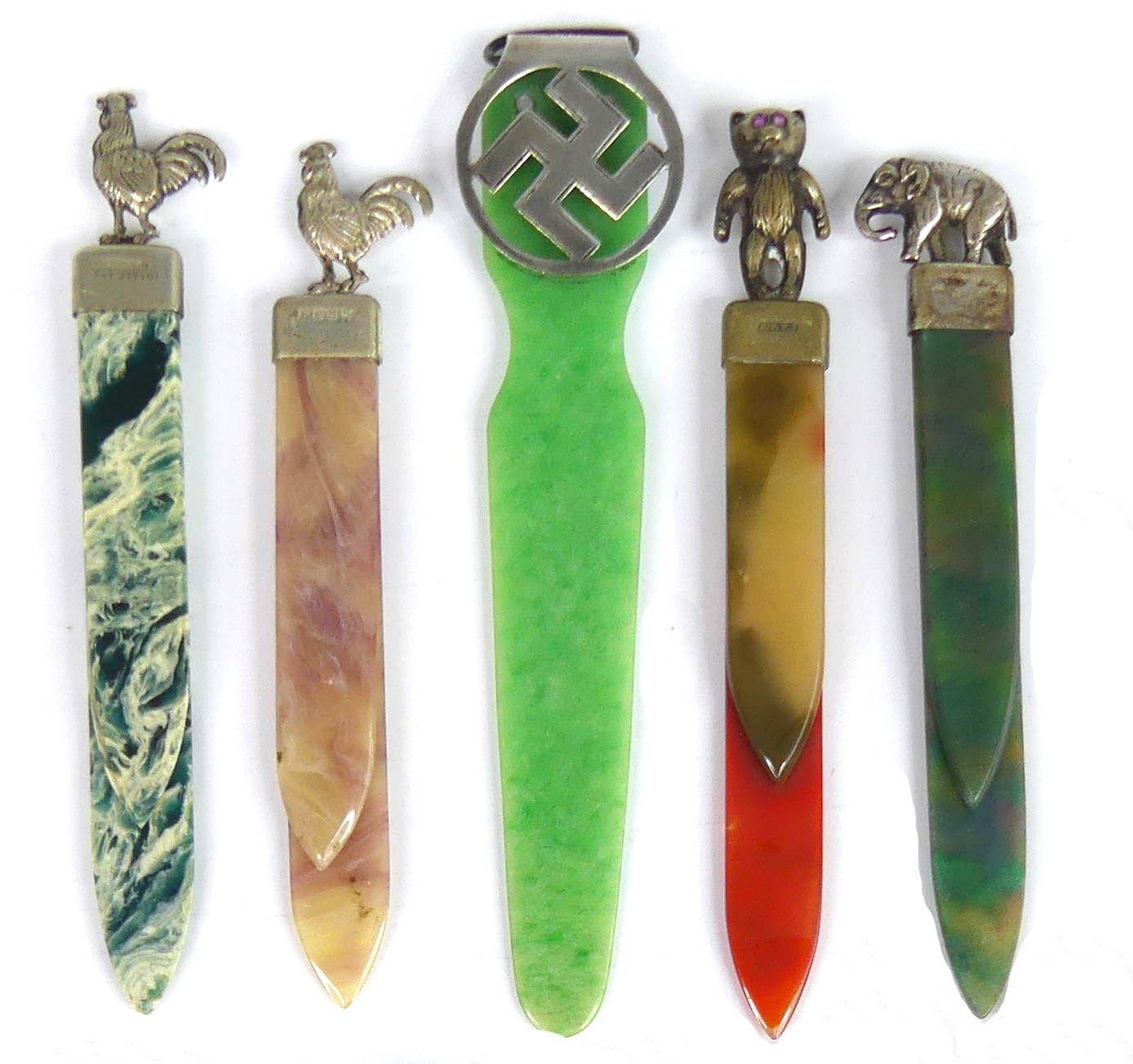 My personal favourite is the charming Edwardian cat and mouse on a marble cheese-wedge weighted example at the top of this page; a rare survivor with both sections to either end of the ribbon and the cat’s eyes still intact, but there are so many quirky and collectable pieces to choose from.